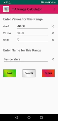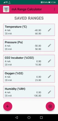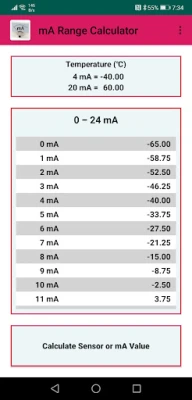 The total range of the sensor is visible between 0 mA and 24 mA in steps of 1 mA. If you want a detailed list of a specific mA value, just click the row of the value of interest and you will get the values for each tenth of that specific mA value. This can be continued for every hundredth and even for every thousandth of a value! Entering more digits in the mA range field will make all results have those digits. So with this you can set your own resolution. Press the button "Calculate sensor or mA value" if you want to calculate a specific mA value that corresponds to a sensor value or vice versa. Save up to 20 ranges with their units and name and easily pick one.