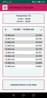 The total range of the sensor is visible between 0 mA and 24 mA in steps of 1 mA. If you want a detailed list of a specific mA value, just click the row of the value of interest and you will get the values for each tenth of that specific mA value. This can be continued for every hundredth and even for every thousandth of a value! Entering more digits in the mA range field will make all results have those digits. So with this you can set your own resolution. Press the button "Calculate sensor or mA value" if you want to calculate a specific mA value that corresponds to a sensor value or vice versa. Save up to 20 ranges with their units and name and easily pick one.